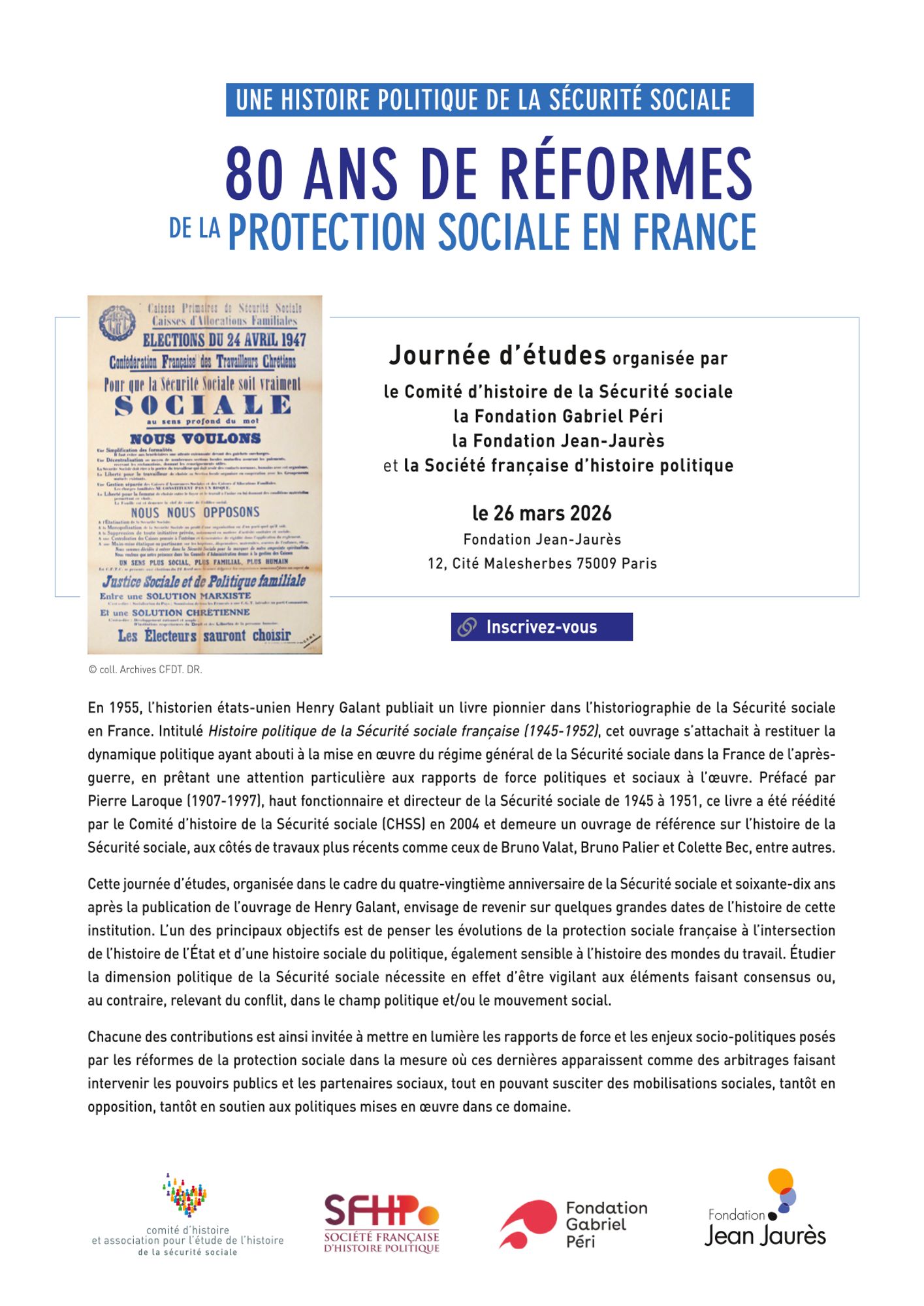 Cette journée d’étude proposée par le Comité d’histoire de la Sécurité sociale, la Fondation Gabriel Péri, la Fondation Jean-Jaurès et la Société française d’histoire politique envisage de revenir sur quelques grandes dates de l’histoire de la Sécurité sociale. L’un des principaux objectifs est de penser les évolutions de la protection sociale française à l’intersection de l’histoire de l’État et d’une histoire sociale du politique, également sensible à l’histoire des mondes du travail. Étudier la dimension politique de la Sécurité sociale nécessite en effet d’être vigilant aux éléments faisant consensus ou, au contraire, relevant du conflit, dans le champ politique et/ou le mouvement social.