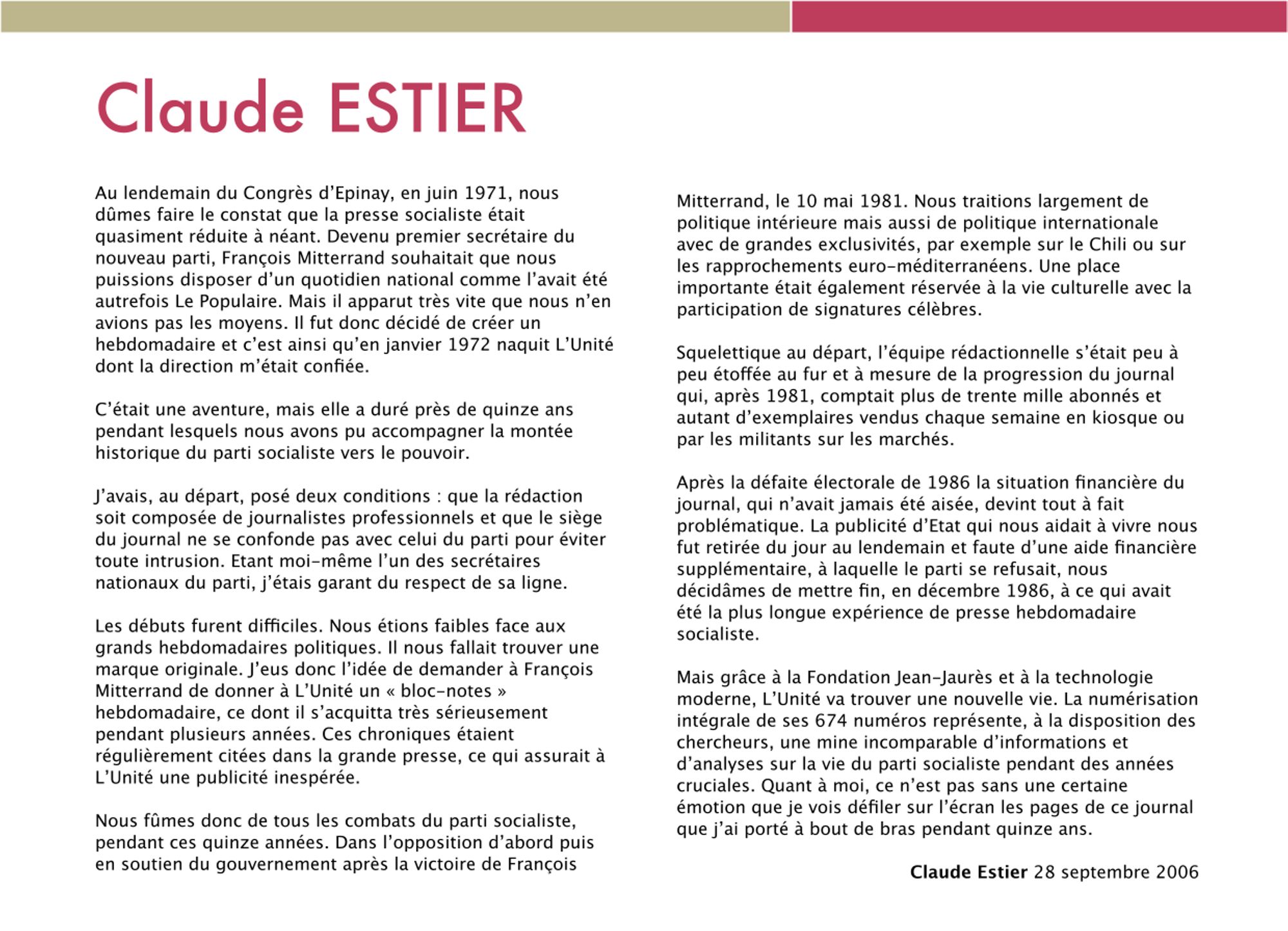 À la suite du congrès d’Épinay, le Parti socialiste décide de lancer son hebdomadaire. Le journaliste Claude Estier en assure la direction depuis le premier numéro. L'Unité fut la seule véritable publication du PS a être diffusée quelques années en kiosque.