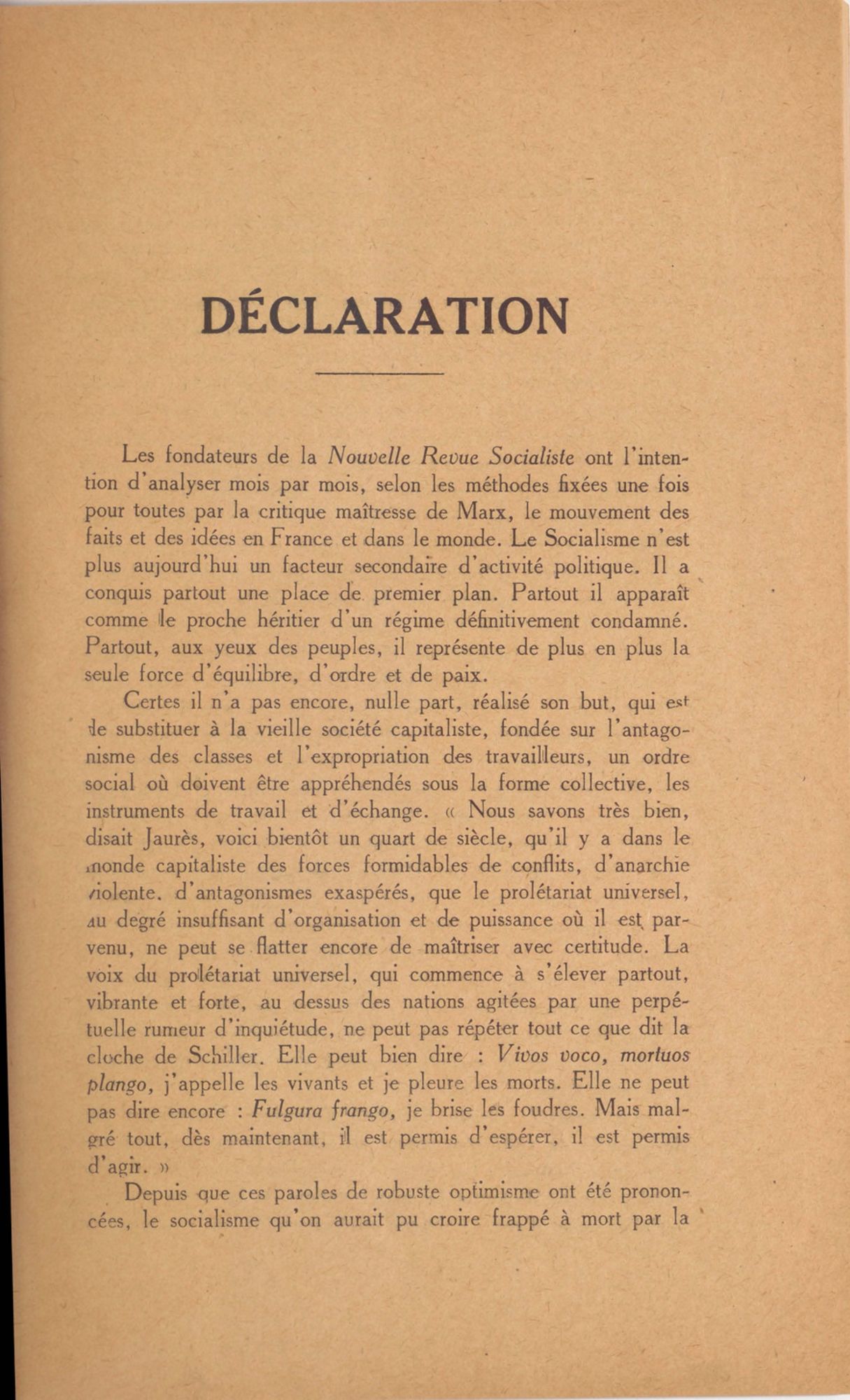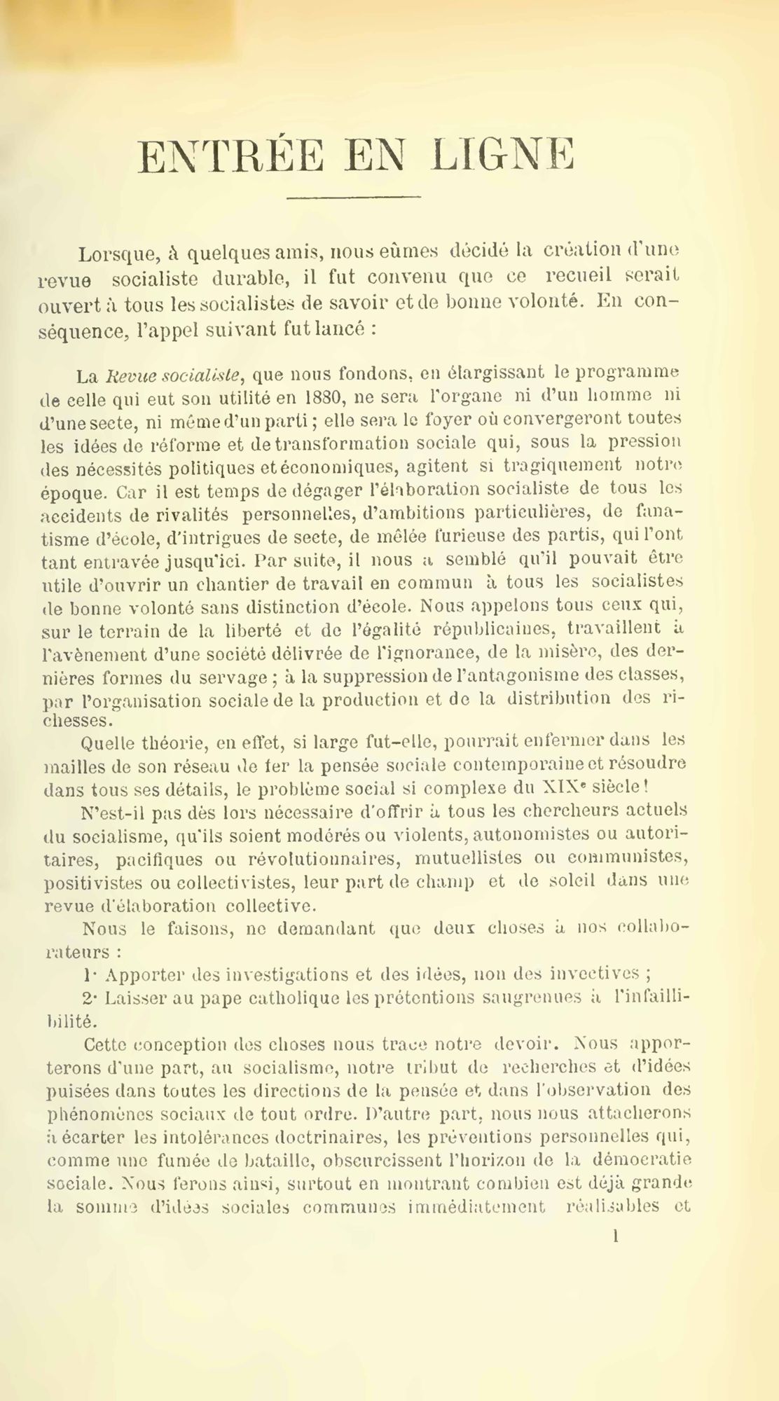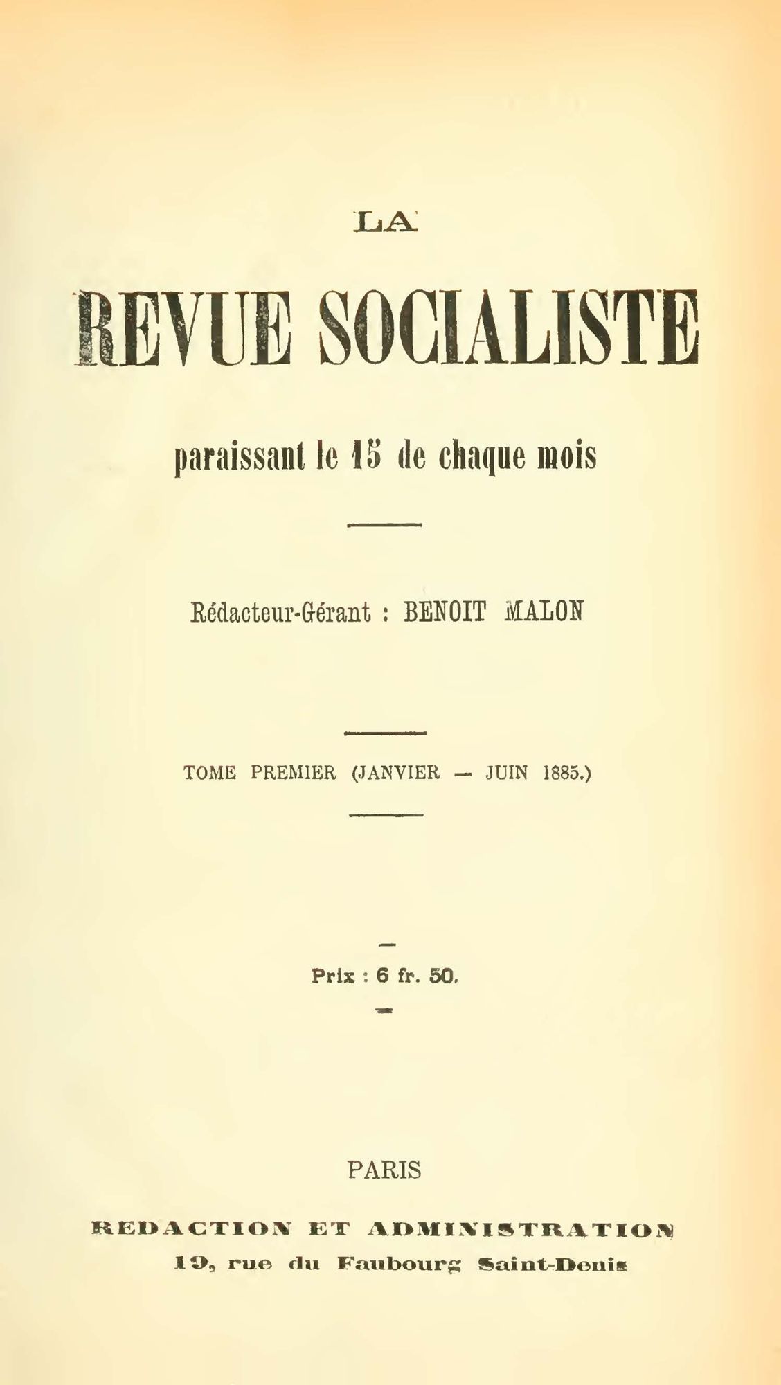 La Revue socialiste, que nous fondons, en élargissant le programme de celle qui eut son utilité en 1880, ne sera l'organe ni d'un homme ni d'une secte, ni même d'un parti ; elle sera le foyer où convergeront toutes les idées de réforme et de transformation sociale qui, sous la pression des nécessités politiques et économiques, agitent si tragiquement notre époque.
