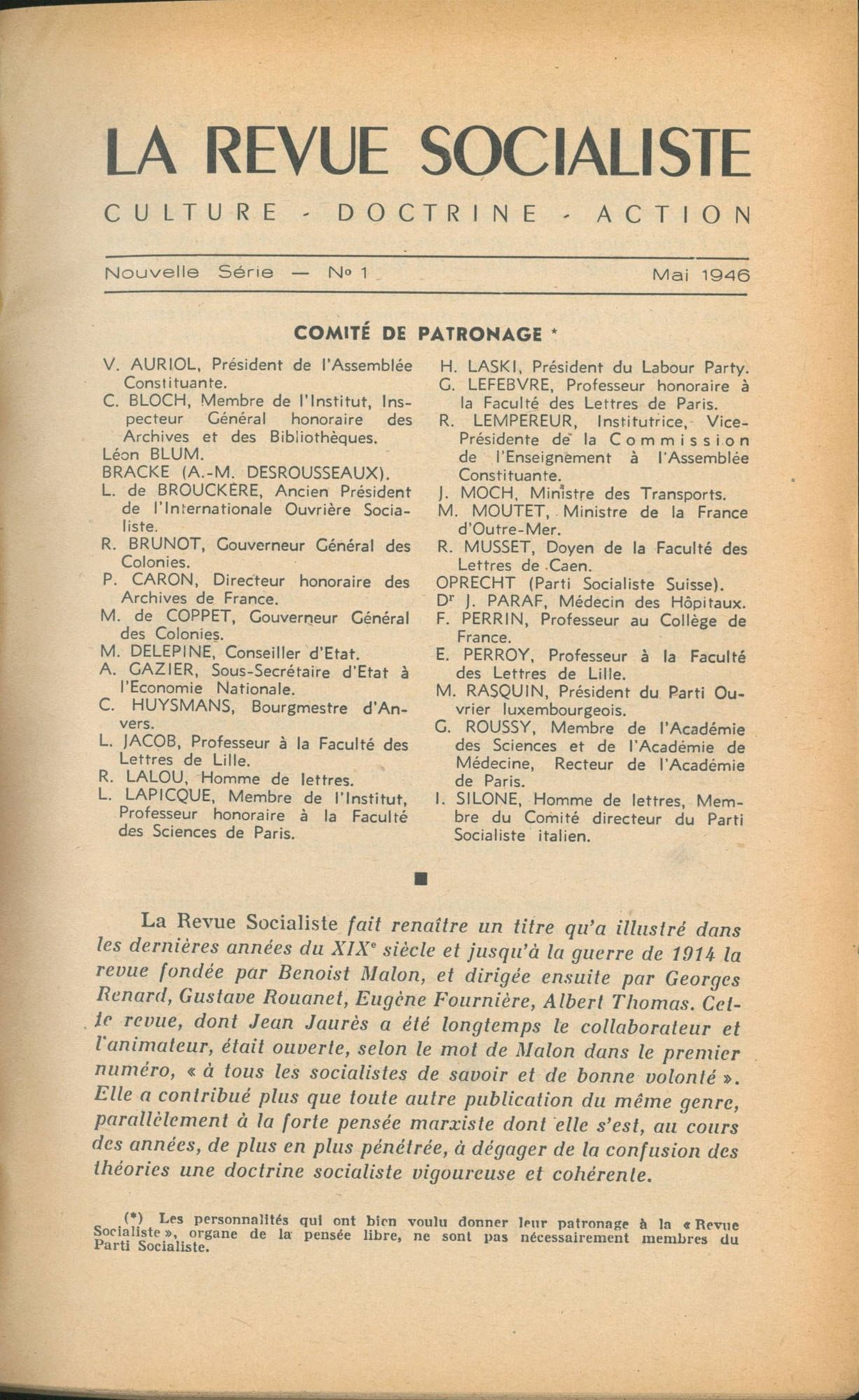 La Revue Socialiste, éditée en commun par le Parti Socialiste et par le Cercle d'Etudes Socialistes Jean Jaurès, donnera à la démocratie française l'organe de libre discussion, la documentation objective dont elle a besoin pour faire ce choix. Sa formule est plus large encore que celle de s'a devancière. Ce n'est pas seulement à tous les socialistes, c'est à tous les hommes « de savoir et de bonne volonté » qu'elle s'adresse pour les convier à participer à ses travaux.