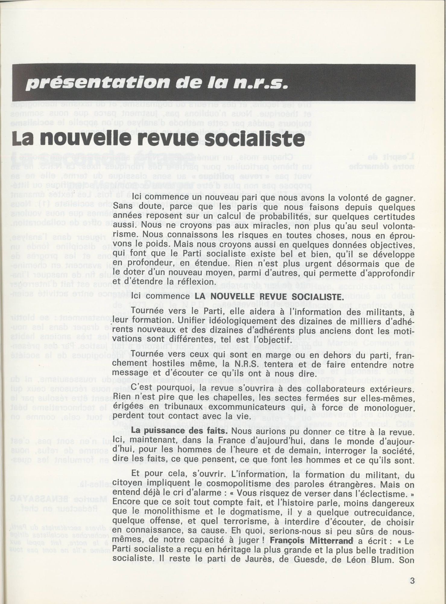 Après le congrès d’Épinay (11-13 juin 1971), le Parti socialiste se préoccupe d’abord très peu de la revue qui parvient occasionnellement à sortir d’ultimes numéros sous la direction de Roger Pagosse (1972-1973). Premier secrétaire, François Mitterrand décide de la relancer en prenant sa direction officielle. Une nouvelle appellation est chargée de signifier une rupture (Nouvelle Revue socialiste), destinée à reconquérir plus d’influence au sein du monde intellectuel, davantage tourné vers les communistes ou les héritiers de mai 68. La revue est conçue sous la responsabilité de Maurice Bennassayag, rédacteur en chef de 1974 à 1979, directeur-adjoint de 1979 à 1986, assisté par Françoise Castro, rédactrice en chef de 1979 à 1981 puis par Alain Meyer de 1981 à 1986.
