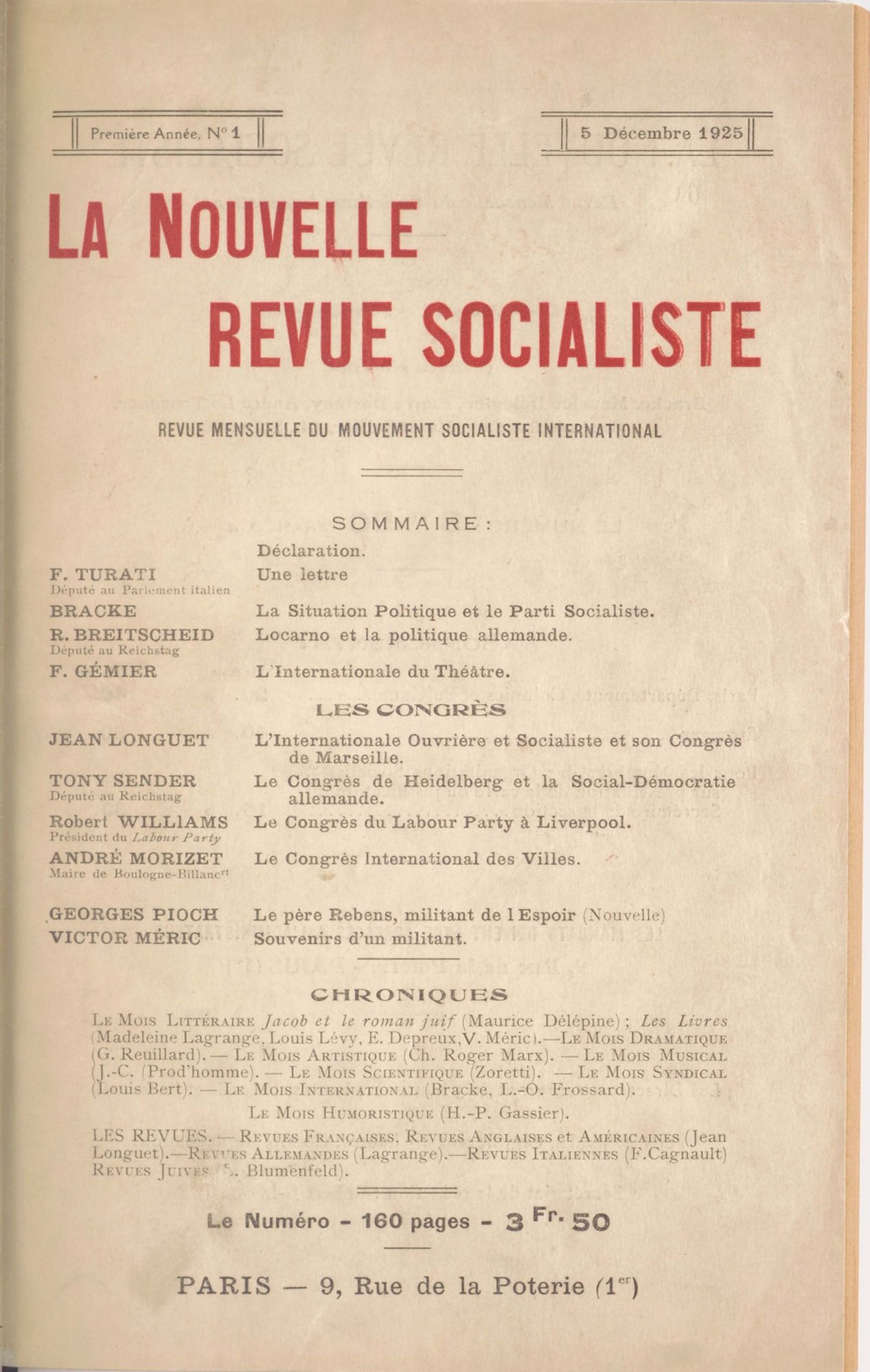 « Un parti est d’abord une mémoire » aimait à dire Jean Longuet. C’est peut-être la raison pour laquelle, tout en songeant plutôt à l’exemple du Mouvement socialiste dont il avait été co-fondateur, Jean Longuet baptisa la revue lancée le 5 décembre 1925 La Nouvelle Revue socialiste11. Puisque le choix fondamental de « garder la vieille maison » était acté, il fallait l’assumer jusqu’au bout. Du reste, Longuet avait parfois collaboré aussi à La Revue socialiste au temps où celle-ci était dirigée par Gustave Rouanet. Comme ses prédécesseuses de 1880 et de 1899, la revue insiste sur son ambition internationale. Elle s’enorgueillit de la coopération des responsables de l’Internationale Ouvrière Socialiste réunifiée au congrès de Hambourg (21-25 mai 1923). La Nouvelle Revue socialiste a deux directeurs : Jean Longuet, qui s’occupe davantage du contenu rédactionnel, et Louis Oscar Frossard, l’ancien secrétaire général de la SFIO puis de la SFIC qui a rompu avec le PCF le 1er janvier 1923 et prépare désormais son retour à la SFIO, devenu un homme de presse et de réseaux. Tous les courants et toutes les générations du socialisme sont représentés au sein du comité de rédaction : le guesdiste Bracke, le très jaurésien Gustave Rouanet, André Le Trocquer et Maurice Délépine, deux avocats proches de Jean Longuet pendant la guerre, Henri Sellier qui revient du PCF, tout comme Pierre Dormoy. La revue se veut ouverte aux jeunes : d’où l’intégration au comité de rédaction de Charles Spinasse, puis de Jules Moch en 1928, de Marcel Déat en 1930. Parmi les étudiants socialistes, Raymond Aron et Claude Lévi-Strauss donneront ainsi quelques notes de lecture à la revue. Le secrétariat de rédaction est assuré par Robert Longuet, fils du directeur, puis par Berthe Fouchère, une institutrice militante à La Bataille socialiste. Les universitaires y participèrent assez peu : quelques articles d’Henri Sée, Albert Mathiez, André Philip ou Ludovic Zoretti, professeurs mais aussi militants notables. Outre l’international, la revue s’ouvre largement à la littérature et aux arts : Firmin Gémier est au sommaire du premier numéro avec un article sur « l’Internationale du théâtre ». Madeleine Léo-Lagrange défend l’œuvre de Marcel Proust et Maurice Delépine celles de Knut Hamsun, Léon Werth et Panaït Istrati. La vie de la revue se révèle difficile : mensuel en 1926 et 1927, le rythme de parution devient bimestriel en 1928 et 1930 avec un seul numéro en 1929. Frossard qui devait faire les frais de la revue (évalués en 1928 à 20 000 francs par an) la quitte en 1930. Longuet s’associe alors à Amédée Dunois pour un ultime numéro en 1931.