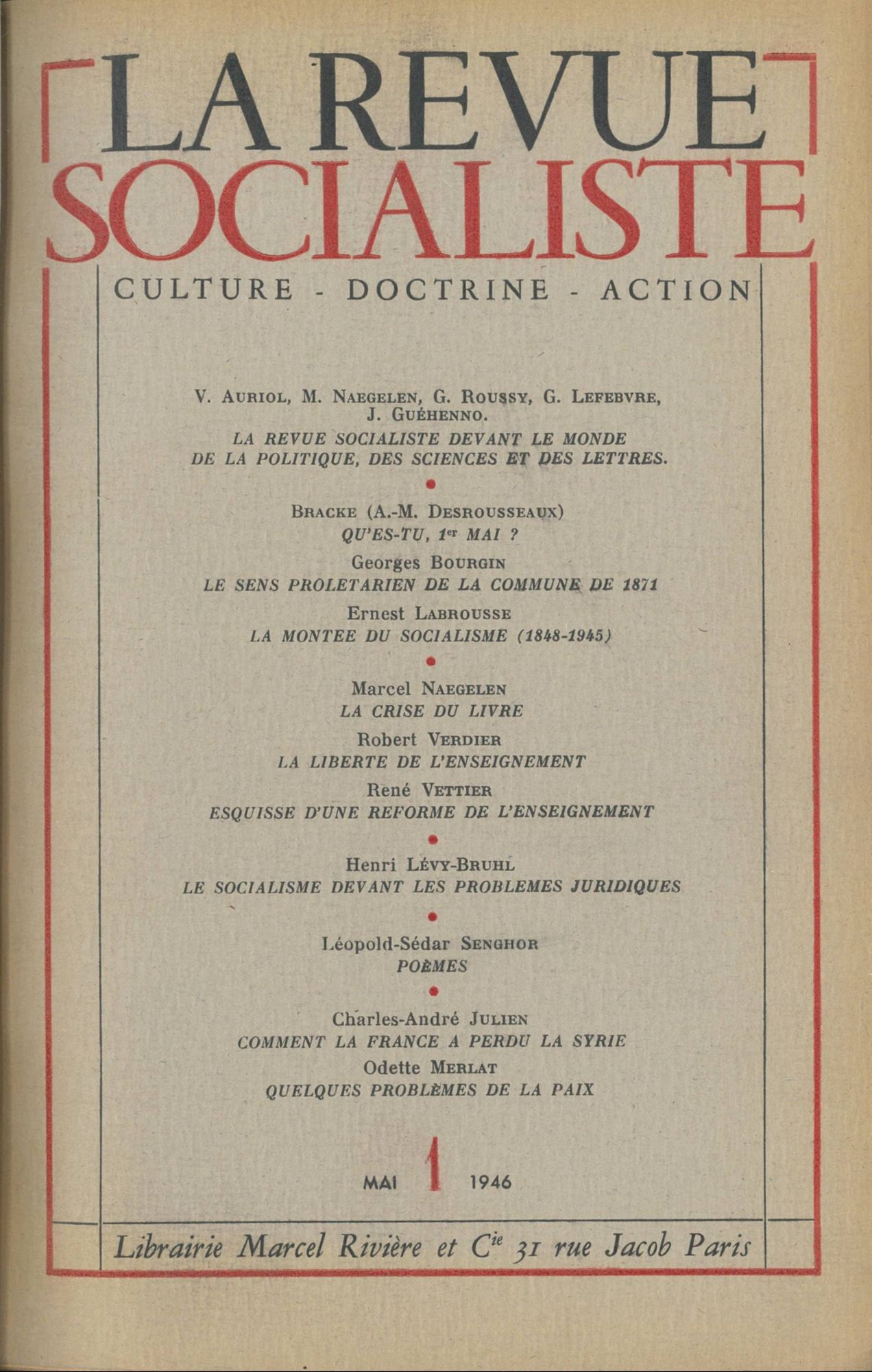 Après la Libération, le socialisme s’estime « maître de l’heure » (Léon Blum) même si les résultats électoraux (23, 5 % en 1945, 18 % fin 1946) et les difficultés politiques, économiques et sociales modèrent vite ses espérances. Néanmoins, il occupe une place centrale dans les institutions (Vincent Auriol président de la République, direction puis participation gouvernementale) et a restauré son autorité politique. Robert Verdier, secrétaire-adjoint de la SFIO dans la Résistance, et les enseignants socialistes des Cercles Jean Jaurès souhaitent restaurer une revue socialiste pour animer le débat intellectuel. La grande différence avec les cas précédents est qu’il s’agit cette fois d’une revue prise en charge et financée par le parti lui-même (réunion du comité directeur du 13 mars 1946). La Revue socialiste paraît sous la direction de l’historien Ernest Labrousse, professeur à la Sorbonne, habitué des combats politiques (ancien lycéen libertaire, journaliste socialiste puis communiste, devenu universitaire, proche de Léon Blum) avec un comité d’honneur comportant des grands noms de l’Université, tel l’historien Lucien Febvre, qui avait milité à la SFIO dans sa jeunesse. La revue est administrée et distribuée par la Librairie Marcel Rivière et gérée au quotidien par son secrétaire de rédaction, l’agrégé des lettres Roger Pagosse, ancien animateur des Étudiants socialistes au temps du Front populaire, un des fondateurs de la Société d’études jaurésiennes (1959)