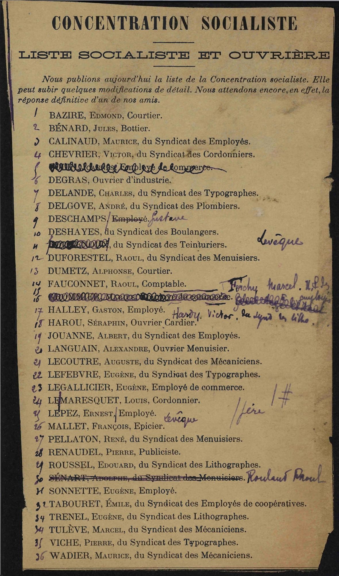 Plusieurs autres documents évoquent la préparation de ces élections, avec l’organisation de la campagne électorale : ces éléments sont connus grâce aux procès-verbaux des réunions de la « concentration socialiste ». Des « souscriptions » dont chaque groupe doit s’acquitter et « des soirées et causeries familiales » sont envisagées pour permettre de financer la campagne12. Cette organisation matérielle de la campagne électorale est assurée par une commission électorale dirigée par Renaudel dès le 22 janvier13. Par ailleurs, la décision de présenter une liste socialiste semble motivée par le contexte social dans le département avec les conflits menés dans l’industrie textile : « nos candidats sont des syndiqués connus comme militants du socialisme ou de l’action syndicale, c’est à dire qu’ils représentent l’élément du travail dans sa plus haute expression14».