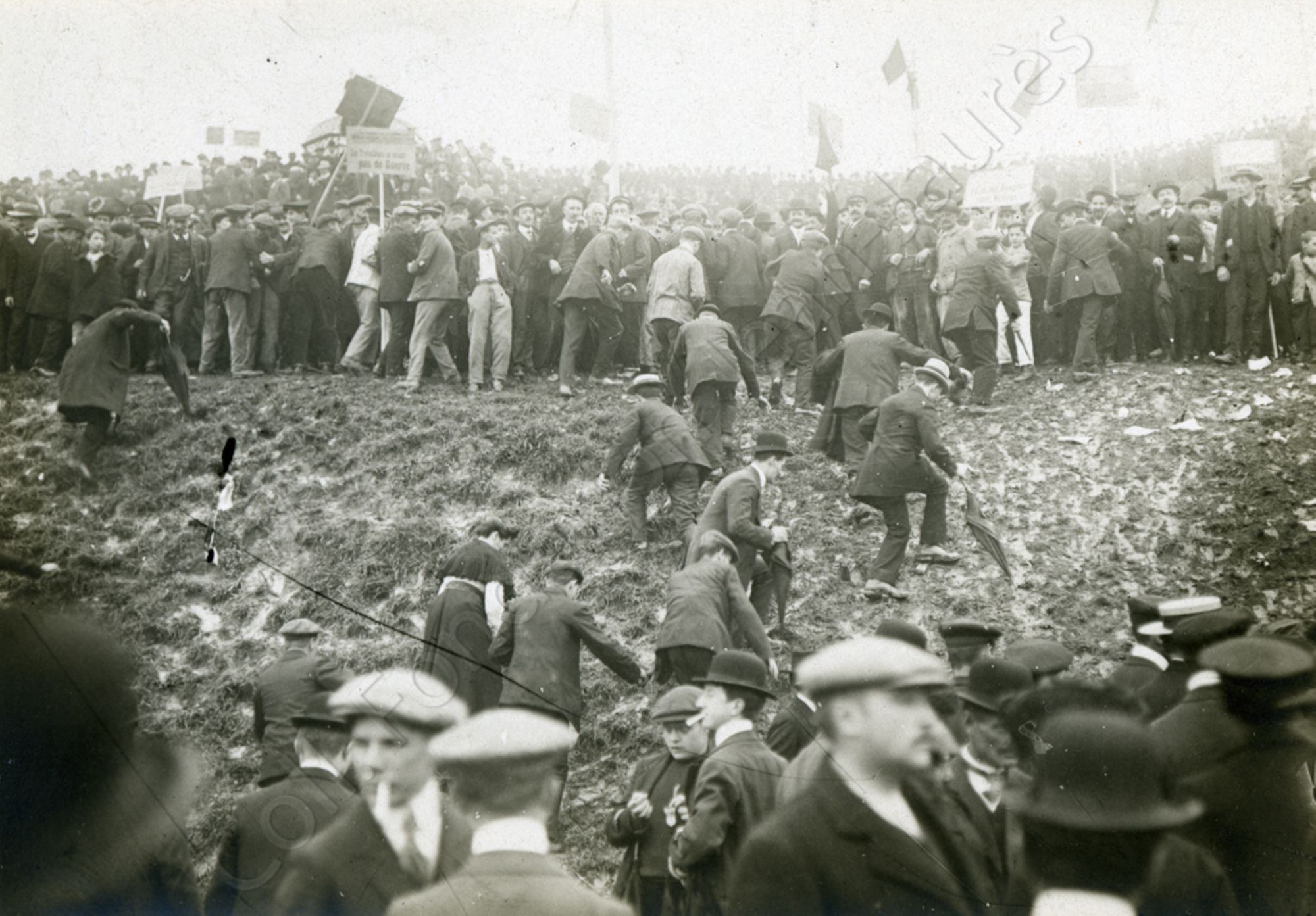 Combien y a-t-il de personnes ? La presse militante affirme qu’il y a dans l’après-midi plus de 50 000 personnes : ainsi, le journal La Guerre sociale de Gustave Hervé précise : « Cette réunion en plein air de 60 000 syndicalistes, socialistes ou anarchistes parisiens était si imposante, si impressionnante » tout en indiquant que la pluie a sans doute découragé de nombreuses personnes11. Les rapports de police, quant à eux, mentionnent 18 000 manifestants13, après avoir craint une foule considérable dans les jours précédents le meeting14. Si les organisateurs espéraient davantage de monde, L’Humanité du lendemain affirme que c’est « un succès presque inespéré avec cette sale pluie qui avait l’air de tomber exprès sur commande de Caillaux [président du conseil à cette période] pour noyer l’enthousiasme15. » D’autres raisons pour expliquer ce demi-succès sont également mentionnées, comme l’inconfort du lieu, où plusieurs endroits sont escarpés et devenus boueux à cause de la pluie, ainsi que le montrent d’autres photographies.