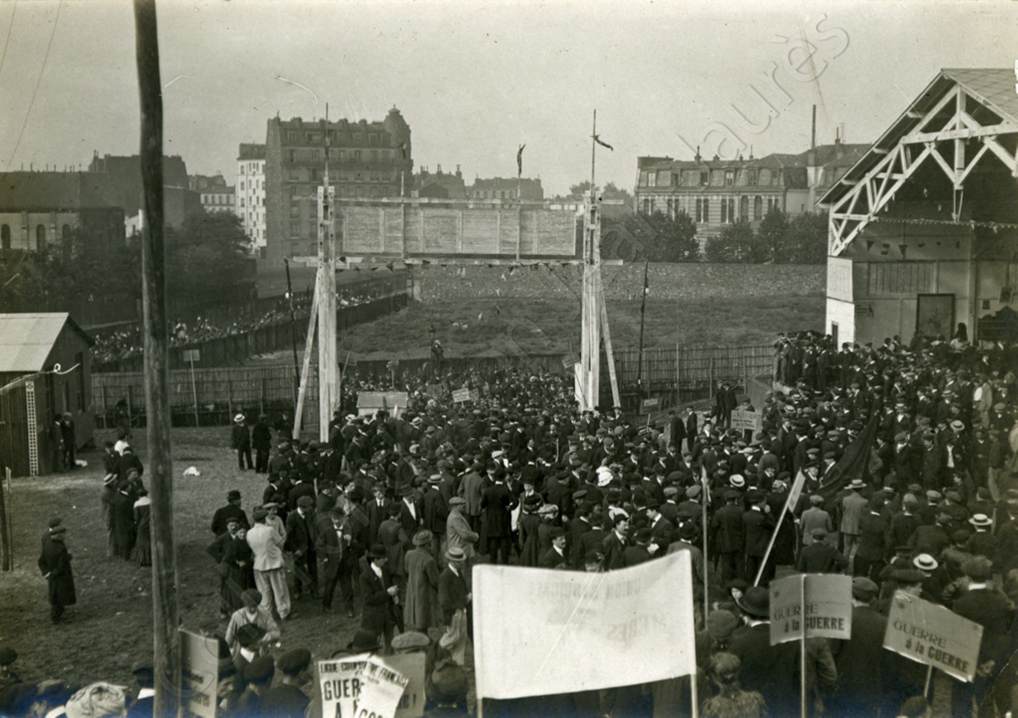 Ce rassemblement pacifiste associant socialistes et syndicalistes est aujourd’hui oublié, tant les mobilisations contre la guerre entre 1912 et 1914 ont davantage marqué les esprits : le congrès international de Bâle de 1912 a impulsé les débuts d’une vaste campagne pacifiste en Europe3 et en France, la manifestation du 25 mai 1913 au Pré-Saint-Gervais est restée dans les mémoires comme le symbole de l’action pacifiste du mouvement ouvrier avant le début de la Grande Guerre4. C’est pourquoi le reportage photographique sur ce rassemblement de l’Aéro-Park, issu du fonds Pierre-Renaudel conservé par la Fondation Jean-Jaurès5, permet de mieux comprendre l’importance de cette première grande manifestation unitaire dans l’histoire du mouvement socialiste et syndical d’avant 1914. Composé de 16 photographies, certaines inédites, d’autres parues dans la presse au lendemain du meeting6, cet ensemble documentaire renseigne concrètement sur les pratiques militantes des opposants à la guerre dans un contexte nouveau. En effet, c’est l’une des toutes premières manifestations nationales contre la guerre qui regroupe l’ensemble des organisations du mouvement ouvrier, les socialistes de la SFIO, les syndicalistes de la CGT, mais aussi les anarchistes et d’autres organisations ouvrières.