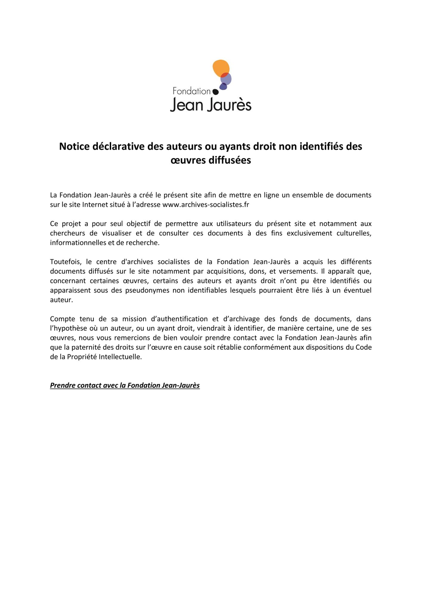 Conformément à l'article 1 des statuts de la Fondation Jean-Jaurès qui précise que cet établissement a notamment pour "buts de favoriser l'étude de l'histoire du mouvement ouvrier et du socialisme international", le présent site a pour objet de mettre, gratuitement et à des fins strictement informationnelles, culturelles, et de recherche, à la disposition des internautes utilisateurs, les archives du mouvement socialiste.